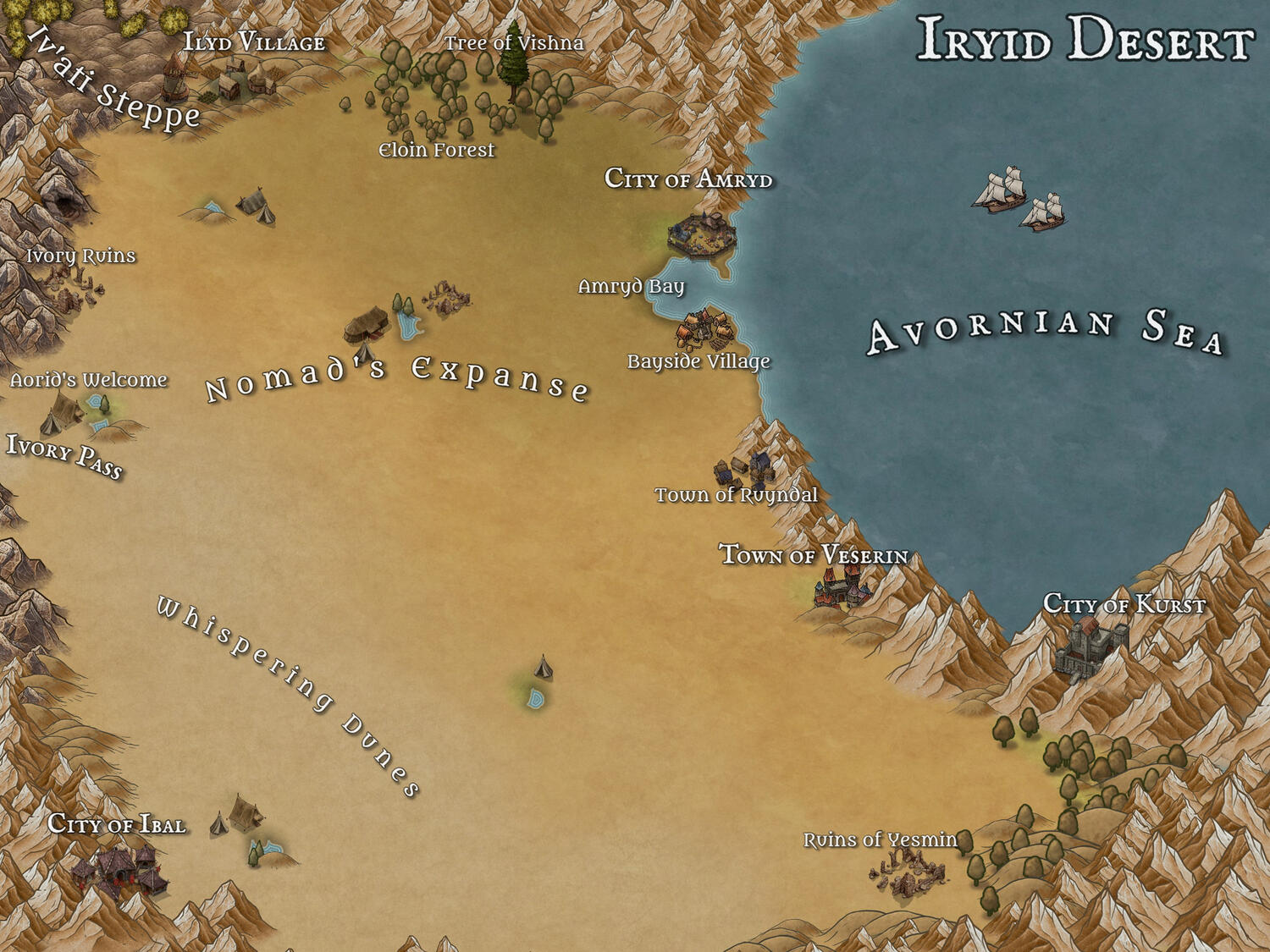 A vast stretch of arid desert reaching from the Ivory Mountains in the west to the Avornian Sea in the east. Bordered by ocean on one side and mountains on the other three, Iryidia is a self-contained land of culture, travel, and harsh enviornments.