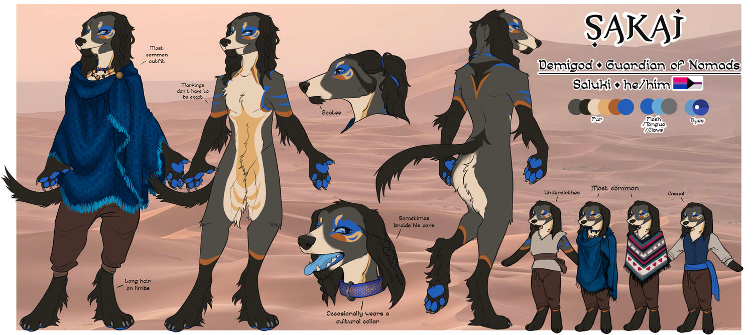 Sakai, or Sandog, as he’s sometimes known in stories, is a demigod and the Patron of Nomads. He is not fully divine, but only semi-mortal. His mother was a simple traveler in the dry deserts of Iryid, who met the God of Oasis, and he fell in love with her. Because of his heritage, Sakai has an ingrained sense of direction and a knack for survivability, able to find shelter and resources for his people no matter where they are. He is not worshipped as a god in most places, but looked up to as a patron. He is welcomed into nomad camps and towns, given offerings in return for his guidance, and his visage is used as a good luck symbol by travelers braving the open desert.Sakai is a charming, easygoing canine who connects with his people. He sometimes travels alone, but more often joins up with wandering groups, helping lead them to their destination. Nights with Sakai are often filled with music and laughter.